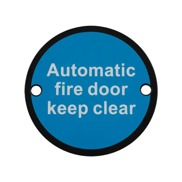 Automatic Fire Door - Keep Clear, part of the signage range in stainless steel. Standard size, 76mm Dia. Two drilled countersunk holes on each side of the sign allow for quick and easy face fix installation. Ideal for use in commercial properties. Available in Both SSS & BSS
